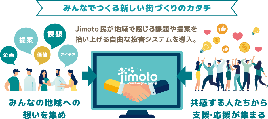 jimotoが動き出すと、ホームページには常にjimoto民から集まった提案が掲載されます。プロジェクトごとに応援の意思表示や実際の支援が行えますし、団体・個人に関係なく提案や協力も募集しています。もちろん、あなたからの提案もおまちしておりますので、ぜひとも一緒に参加して自分たちで暮らす社会をつくっていきましょう。