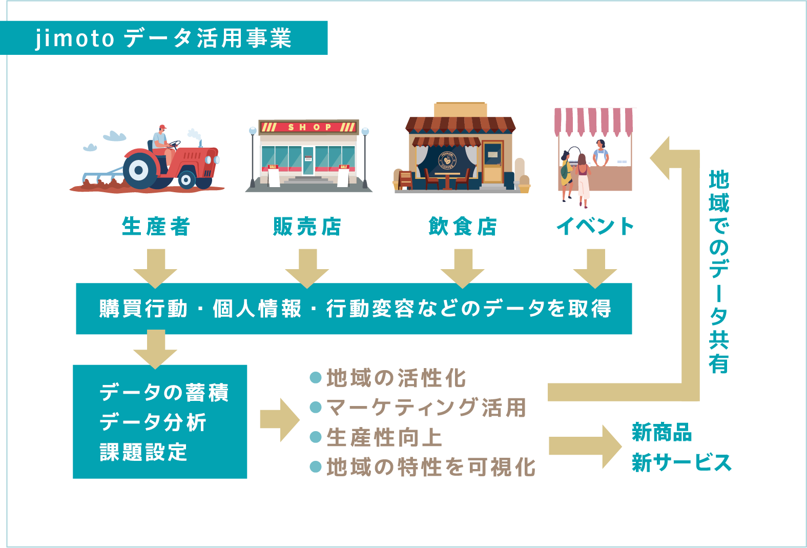 地元の特性や特徴、客観的な把握のためには「データドリブン」な側面も欠かせません。可視化が難しかった情報も、地元であればできることがあります。地元の情報をjimotoで収集し、地元の皆様が公に閲覧できるデータとして還元・共有する。皆様がもっと地元のことを知れる世界へ、データ活用事業を進めています。