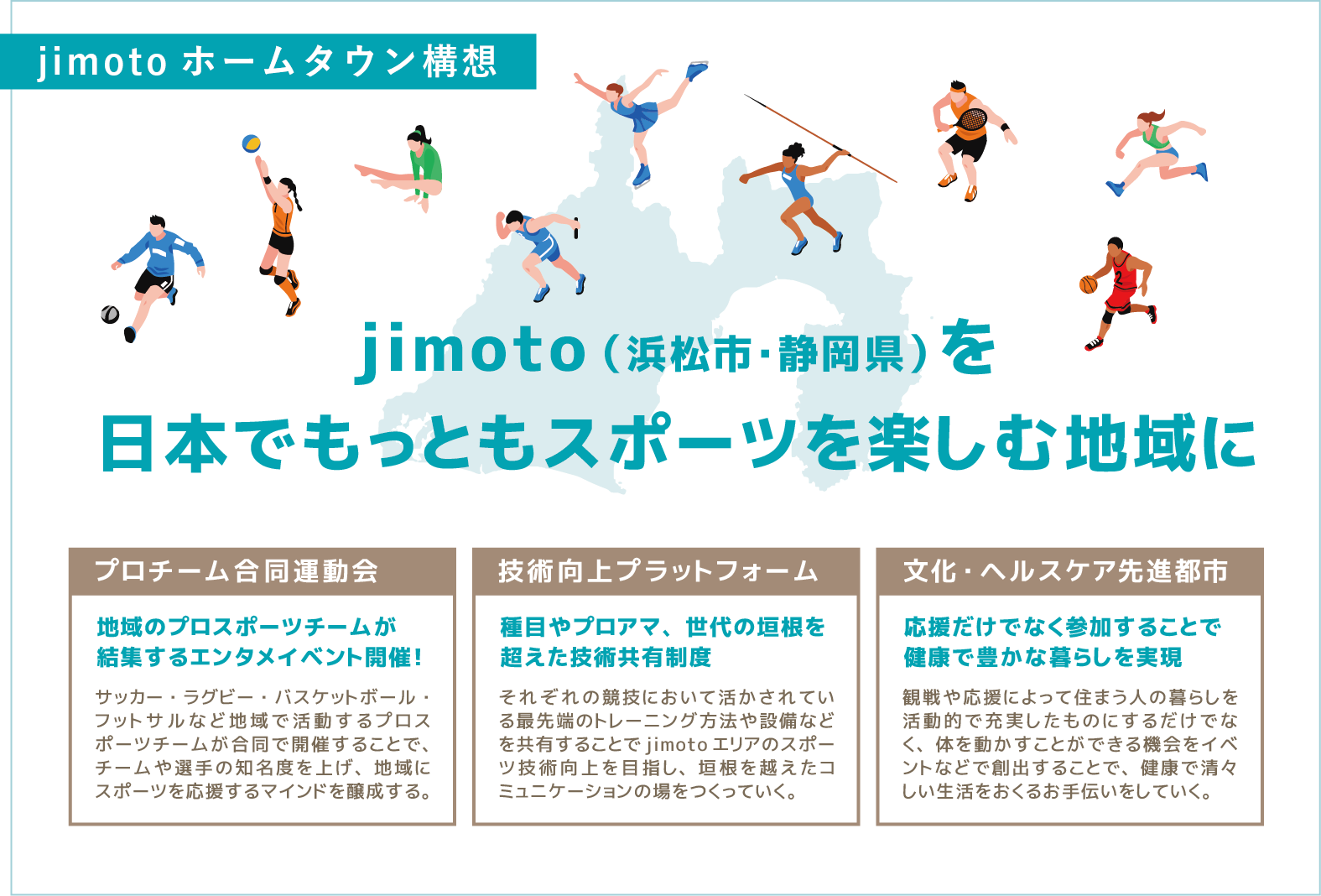 地元で暮らす人たちとプロチーム・プロ選手が関わり、地元のスポーツ文化そのものが一層盛り上がるように。わたしたちのホームが一層誇らしくなるように。jimotoホームタウン構想では、地域とスポーツのより良い世界へ向けて様々な活動を進めています。