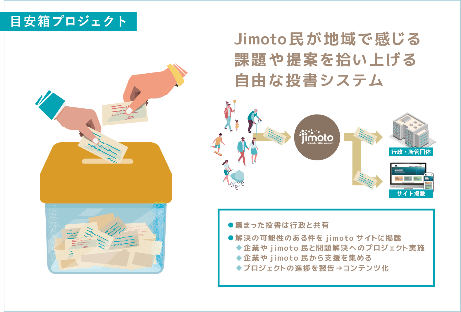 地元の課題や問題。暮らす人たちの目線で見つかる改善や提案。目安箱プロジェクトは皆さまが地域で感じる課題・問題・改善・提案をオンライン上で自由に投書できるシステムです。 Jimoto民として登録するだけで投書が可能。集まった課題や解決はJimotoでピックアップし、各企業や皆様からの支援のもと、改善を実行していきます。必要に応じて外部団体や有識者をアサインし、解決にあたります。