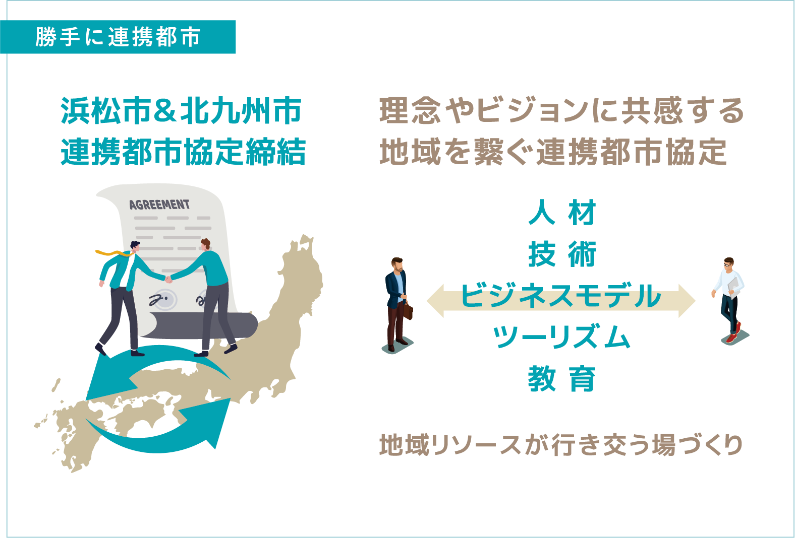 私たちは理念やビジョンに共感する全国の地元と手を取ります。人材・技術・ビジネスモデルなど、地域の多様なリソースが交流し、共通の課題を共に解決。地域課題として挙げられるヒューマンリソース問題を、地域で手を取り合うことで乗り越え、垣根なく地域を共創していく「連携都市協定」を進めています。