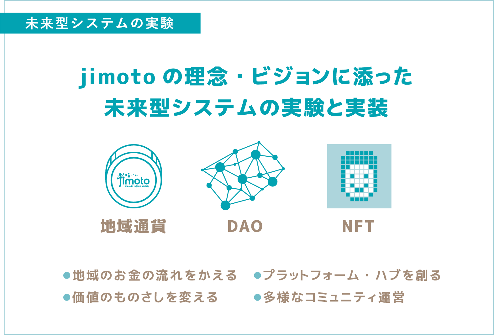 常に新しい技術・思考・環境が変わり続ける社会。IOT・DXの分野は、地元や地域課題の解決の為の有効な手段として大きな可能性を秘めています。jimotoでは地元の未来へ向けて、理念・ビジョンに添った方法で、地域通貨・DAO・NFTなどの技術の「実験」と「試行」を進めています。